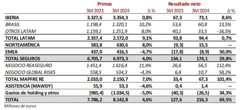 - En Brasil las primas ascienden a 1.320 millones (+10,2%), y reflejan una ligera apreciación del real brasileño (+2,6%). En moneda local, el crecimiento de las primas alcanza el 7,3%, gracias a los Seguros Agrarios y Vida Riesgo.