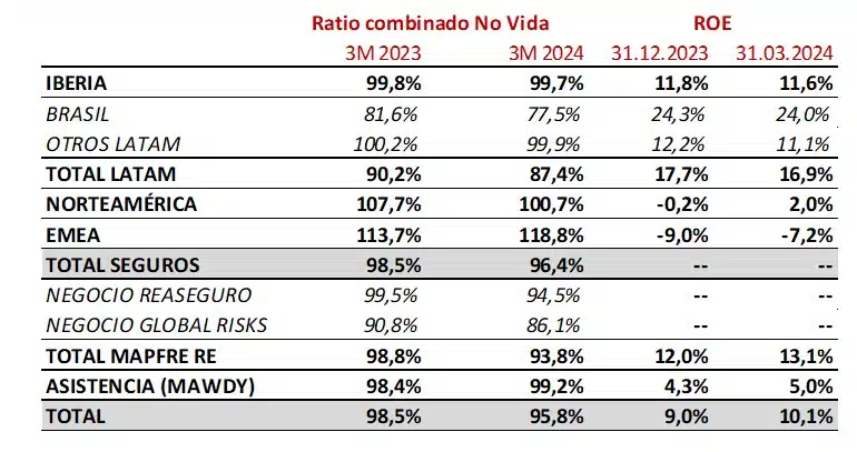- El ratio combinado mejora significativamente en el año hasta el 93,8% (-4,9 p.p.), apoyado en la recuperación de tarifas, especialmente la cobertura catastrófica. No ha habido impactos de siniestros catastróficos relevantes en el trimestre, frente al mismo periodo de 2023 en el que se registró un terremoto relevante en Turquía.
