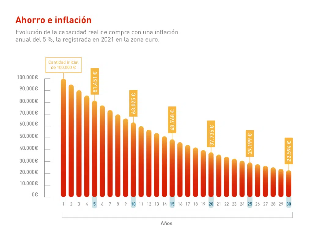 El incremento de los precios se traduce en una lenta pero inexorable pérdida de poder adquisitivo de tus ahorros, un efecto que se puede observar claramente en el siguiente gráfico. En 2021, la tasa inflación se situó en la zona euro en el 5 % según Eurostat.