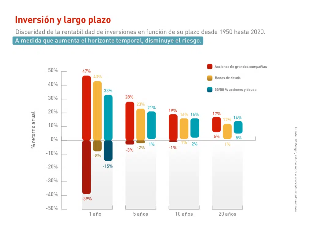 La siguiente imagen muestra un la evolución histórica de varios tipos de inversión: en acciones de grandes compañías, en bonos de deuda y con una cartera al 50 % de ambas, en este caso en el mercado estadounidense. Los porcentajes son los retornos anuales máximos y mínimos de varios periodos, lo que se conoce como la dispersión de rentabilidades. Observamos que a medida que se alarga el plazo de inversión, el riesgo va disminuyendo, y cualquier persona que desde 1950 hubiese invertido a 20 años habría conseguido incrementar sus ahorros.
