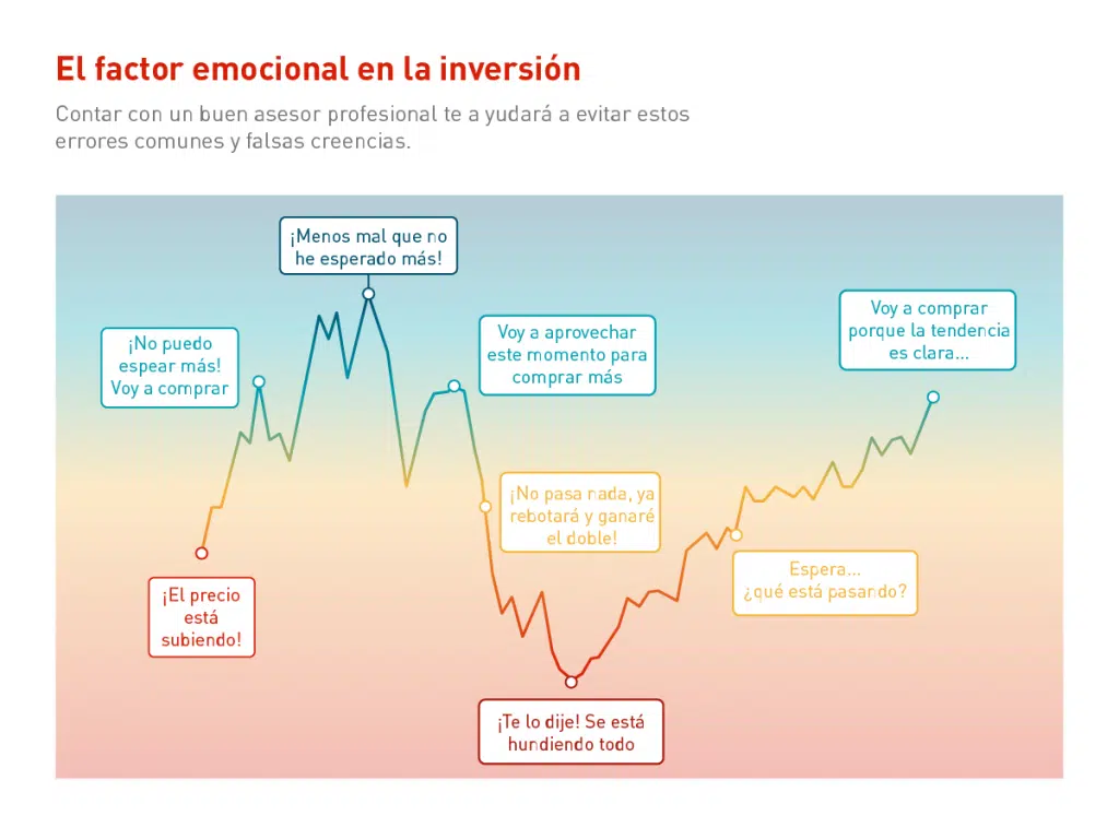 El valor de tus inversiones irá variando, sujeto a las oscilaciones del mercado. Su comportamiento puede ser imprevisible, especialmente para alguien que no está familiarizado. Por ello, al igual que la mejor estrategia es el largo plazo, como hemos observado, otra decisión inteligente es la de recurrir a profesionales, que sabrán encontrar las oportunidades y te darán los mejores consejos. Con un buen asesor, podrás evitar errores tan comunes como los que se ven en el siguiente gráfico.