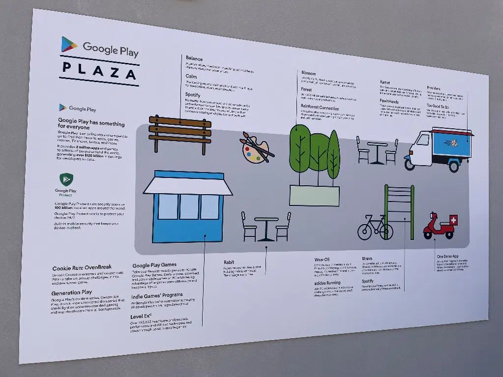 Aprovechando uno de los pasillos exteriores, el gigante Google ha recreado una avenida en forma de ciudad caricaturizada de manera que nos presentan cómo la tecnología Android está presente en nuestra vida diaria, empezando por smartphones y tablets y terminando en dispositivos de voz, domótica o incluso, realidad virtual.