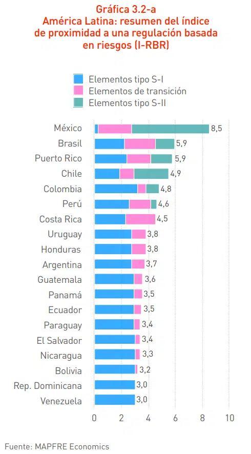 En Latinoamérica hay una gran disparidad en la transición hacia modelos basados en riesgos. El país que se encuentra en un estado más avanzado es México, que obtiene un 8,5 en el indicador de MAFRE Economics y la mayoría de elementos de su regulación pertenecen al grupo C. Brasil y Puerto Rico, ambos con valores de 5,9, se encuentran entre los que tienen normativas más adelantadas en este sentido.