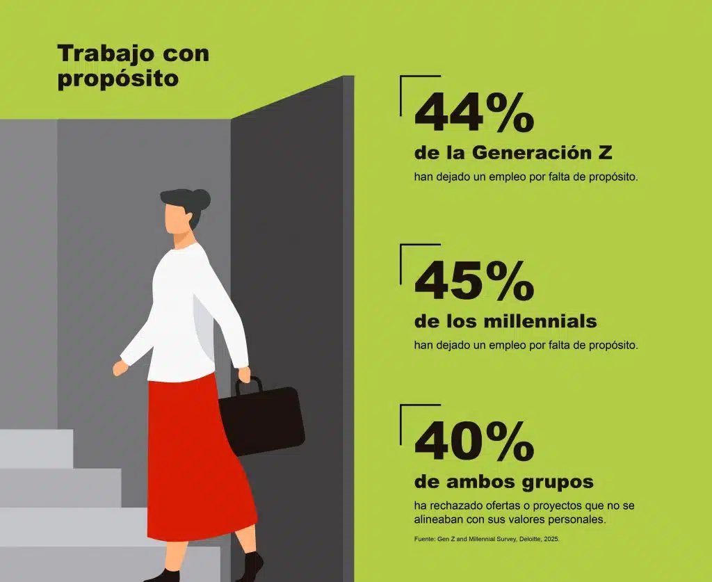 Pero el propósito, como decíamos, no tiene efectos solo en el consumo: también atraviesa la forma en que se organiza, lidera y proyecta la cultura interna de las compañías y se convierte en un elemento esencial de la atracción y retención de talento. De hecho, la ausencia de propósito en el entorno laboral afecta a la motivación y al bienestar emocional. Según el estudio Gen Z and Millennial Survey de Deloitte, cuatro de cada diez personas de las generaciones Z y millennial afirman que la falta de propósito en el trabajo contribuye a su ansiedad y estrés. Esta percepción tiene un impacto directo en sus decisiones profesionales: el 44 % de la Gen Z y el 45 % de la millennial han dejado un empleo por considerarlo carente de propósito y alrededor del 40 % de ambos grupos ha rechazado ofertas laborales o proyectos que no se alineaban con sus valores personales. Estos datos reflejan un cambio profundo en la cultura laboral: el propósito es un factor clave para atraer talento, fidelizar equipos y construir organizaciones sostenibles.