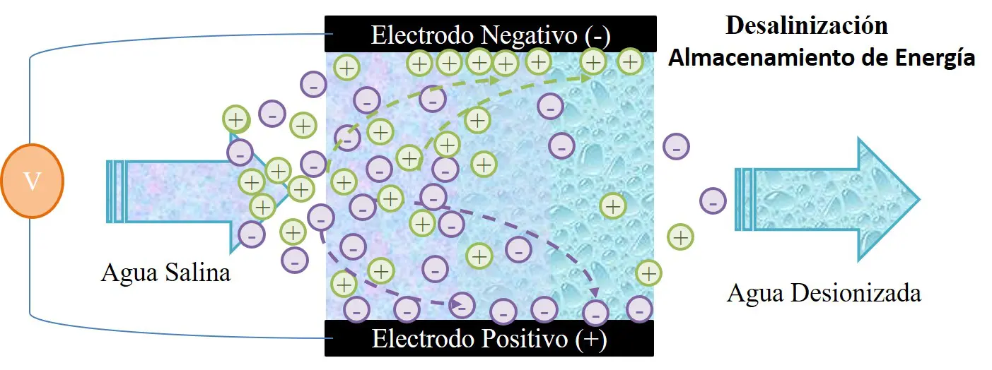 Es decir, lo que conseguimos es que las cargas positivas (los sodios) se absorban en el electrodo negativo, y las cargas negativas (los cloruros) lo hagan en el positivo. De esa manera se reduce su contenido y se puede decir que estamos desalinizando.