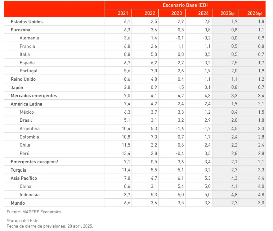 MAPFRE Economics, el Servicio de Estudios Económicos de MAPFRE, ha publicado la actualización de su Informe Panorama Económico y Sectorial, en el que prevé un crecimiento de la economía mundial del 2,7% para 2025, lo que supone cuatro décimas menos de lo estimado a principios de año, y del 3% para 2026. Por su parte, las previsiones de inflación son del 3,4% para 2025 (una décima menos) y del 2,9% para 2026.