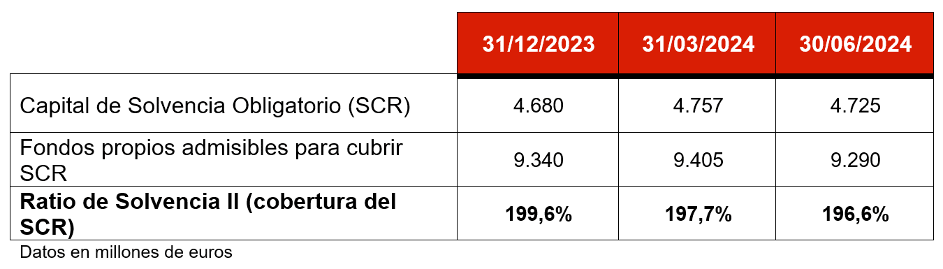 El ratio de Solvencia II del Grupo MAPFRE se situó en el 196,6% a junio 2024. Los fondos propios admisibles alcanzaron 9.290 millones de euros durante el mismo periodo, de los cuales 82,7% son fondos de elevada calidad (Nivel 1).