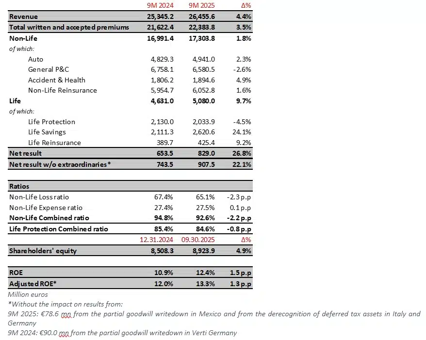 • Turkey and Malta continue to contribute positively, while Germany and Italy significantly reduce losses, improving the combined ratio to 106.7% (from 113.2% in 9M 2024) and the result to €7 million (-€19 million in 9M 2024).