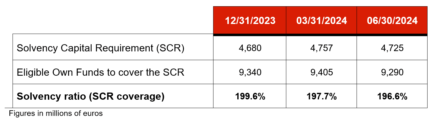 MAPFRE Group Solvency II ratio stands at 196.6 percent at June 2024. Eligible own funds reached nearly 9.3 billion euros at that date, of which 82.7 percent are of high quality (Tier 1).