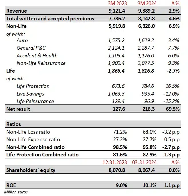 - Premiums grow 4.6%, surpassing €8.1 billion, while revenue stands at close to €9.4 billion.