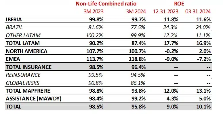 - The combined ratio improves significantly in the year to 93.8% (-4.9 p.p.), supported by the recovery of tariffs, especially catastrophic covers. There have been no impacts from relevant Cat claims in the quarter, compared to the same period in 2023 when there was a relevant earthquake in Turkey.