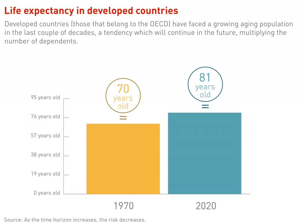Dependency is caused by factors such as age, illness, and disability. All predictions, however, agree that the number of dependents will multiply with the aging of the population, a trend that is unstoppable. In the OECD (the organization that brings together most developed countries), life expectancy in 1970 averaged 70 years. Just before the pandemic, it had already reached 81 and will continue to rise. Thus, the over-65s, who were 9% of the total population of these countries in 1960, now account for 17.3% and will account for 26.7% in 2050. The over-80s, the group that suffers most from dependency, today account for 4.6 % of the population. In 2050, there will be more than twice as many as today.