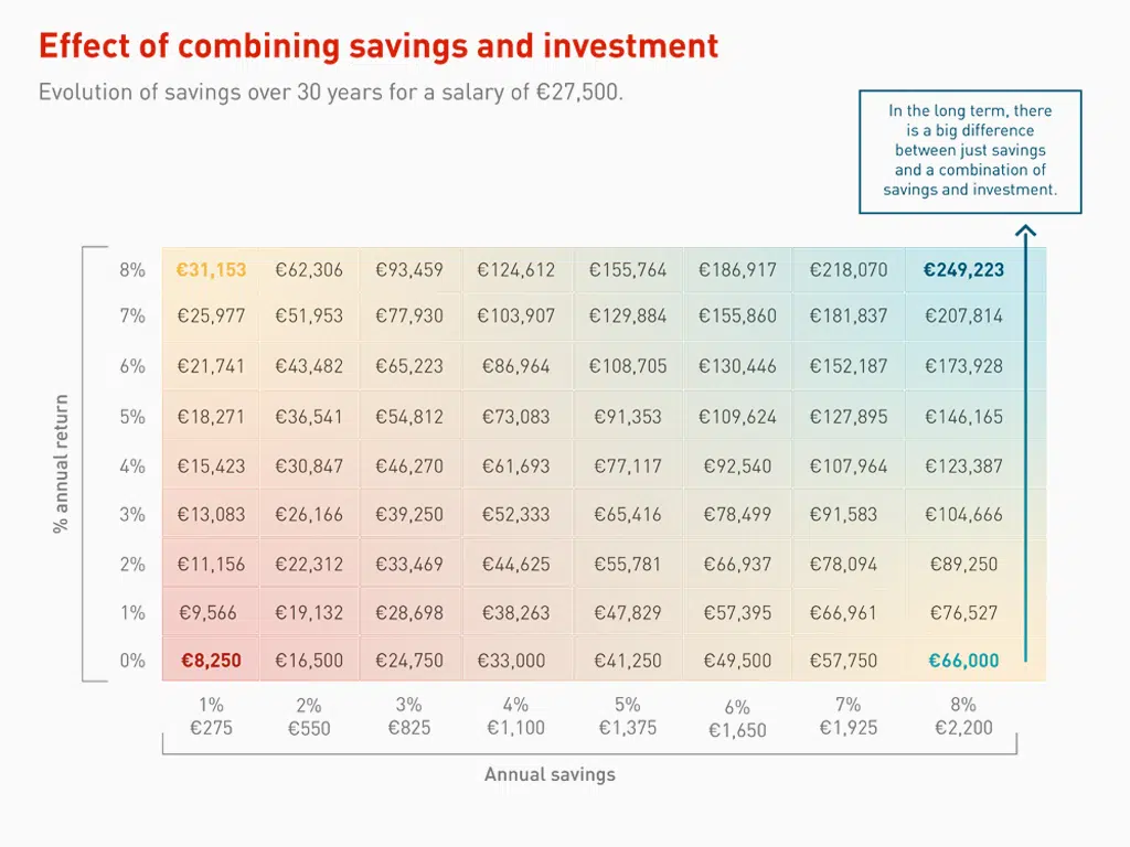 If you manage to contribute regularly to your investments, over time you will see excellent results. This is also the best way to forget about the short-term performance of the markets. This table shows a simulation of the savings growth of a person with a salary of 27,500 euros, according to the amount they save each year and the annual returns obtained.
