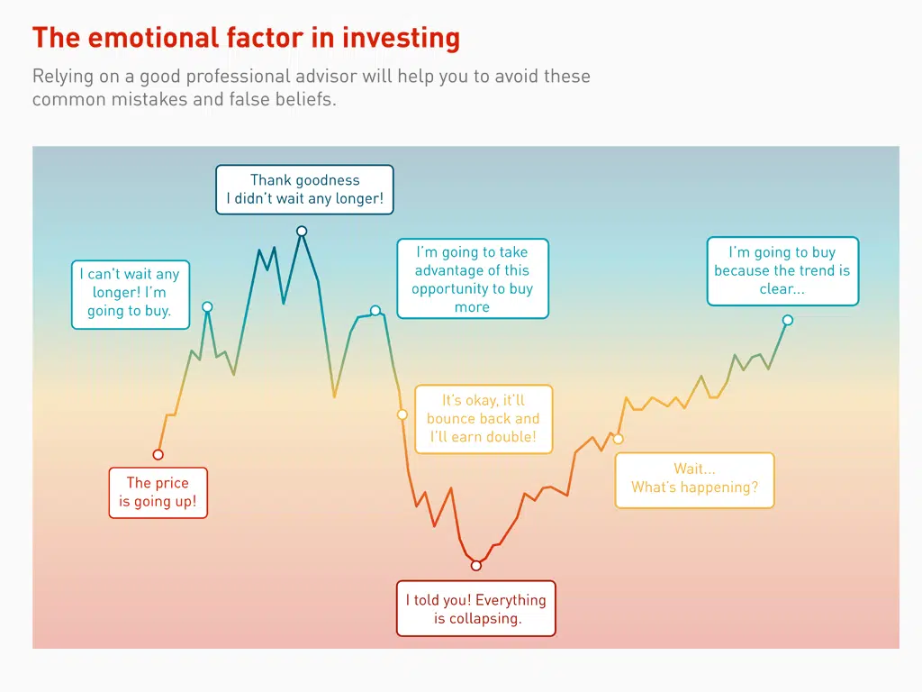 The value of your investments will go up and down, along with the fluctuations in the market. They can behave unpredictably, especially for someone who is unfamiliar with the market. That’s why it’s best to have a long-term strategy, as we have seen. And another smart decision is to seek help from professionals, who will know how to identify opportunities and give you the best advice. A good advisor can help you avoid common mistakes like the ones in the chart below.