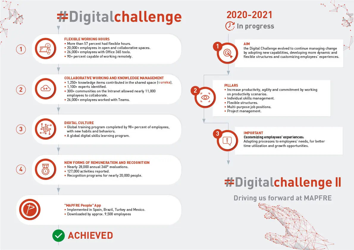 As early as 2018, MAPFRE launched the Digital Challenge to manage the organization’s shift toward a working environment adapted to the digital age by gaining flexibility and agility through collaborative work, knowledge sharing, digital culture and using new forms of remuneration and recognition. At the beginning of 2020, the company changed the challenge (Digital Challenge II) to continue managing change by adopting new capabilities, more dynamic and flexible structures, and customizing the employees’ experiences.