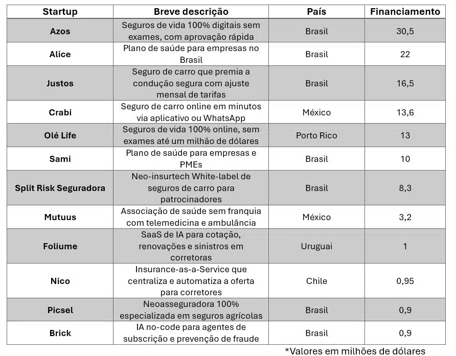 Não todas as rodadas de financiamento são públicas, mas considerando as que são, estes foram os maiores investimentos durante os seis primeiros meses de 2025, de acordo com os dados do último relatório de Digital Insurance Latam: