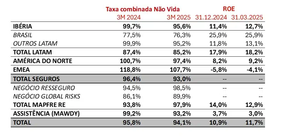 - O índice combinado geral atingiu 97,9% (+4,1 p.p.). O evento mais relevante do trimestre foram os incêndios na Califórnia, com um impacto atribuível de 85 milhões. Durante o trimestre, a companhia manteve a postura prudente no reforço das reservas técnicas.